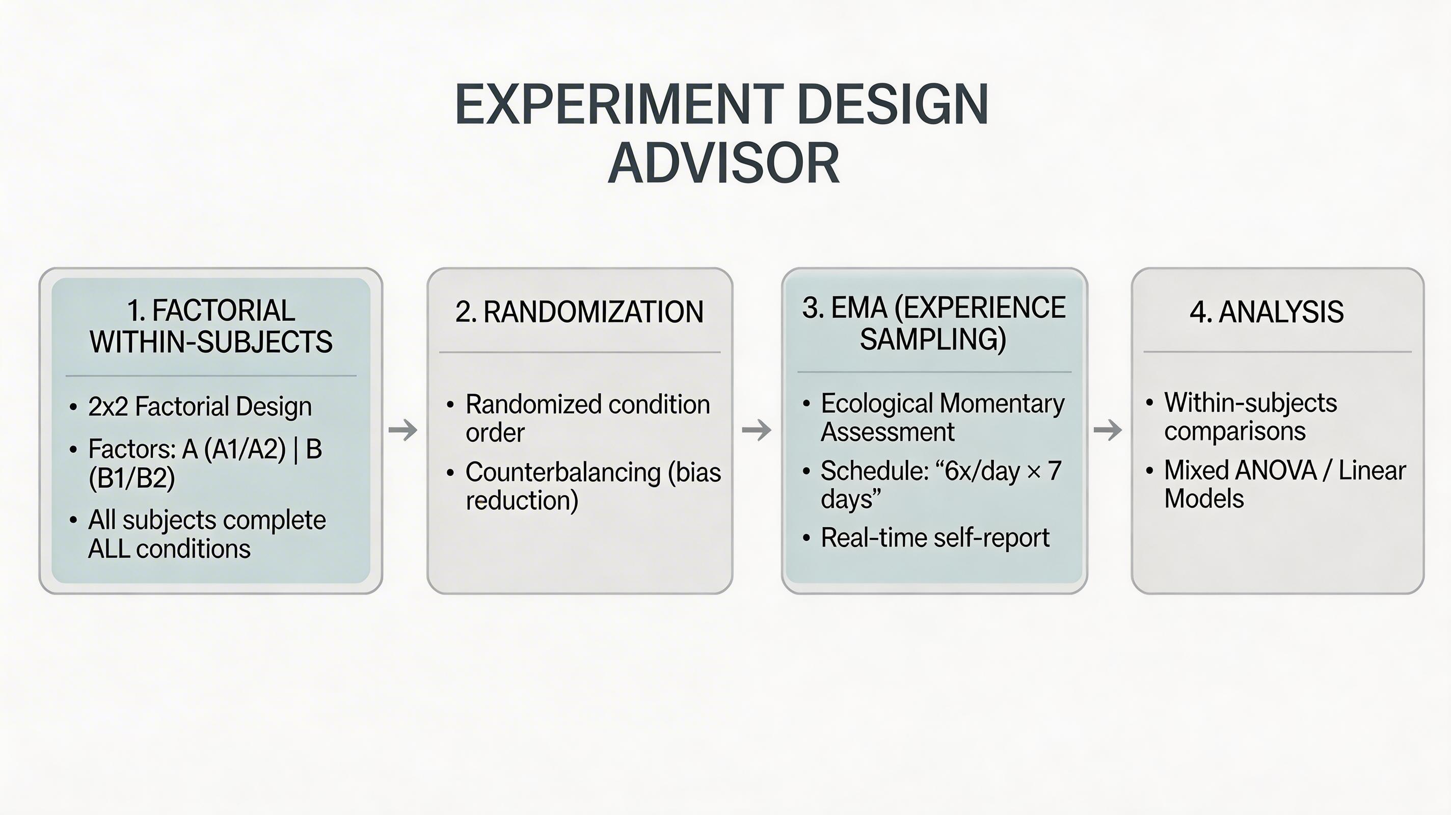 Design valid, efficient experiments — from factorial designs to EMA studies