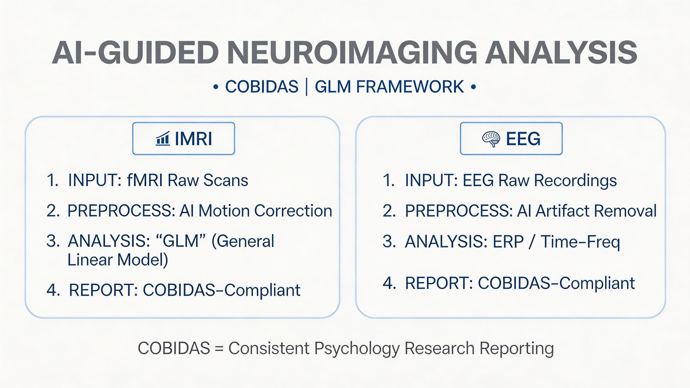 AI-guided workflows for fMRI and EEG data analysis and write-up in psychology
