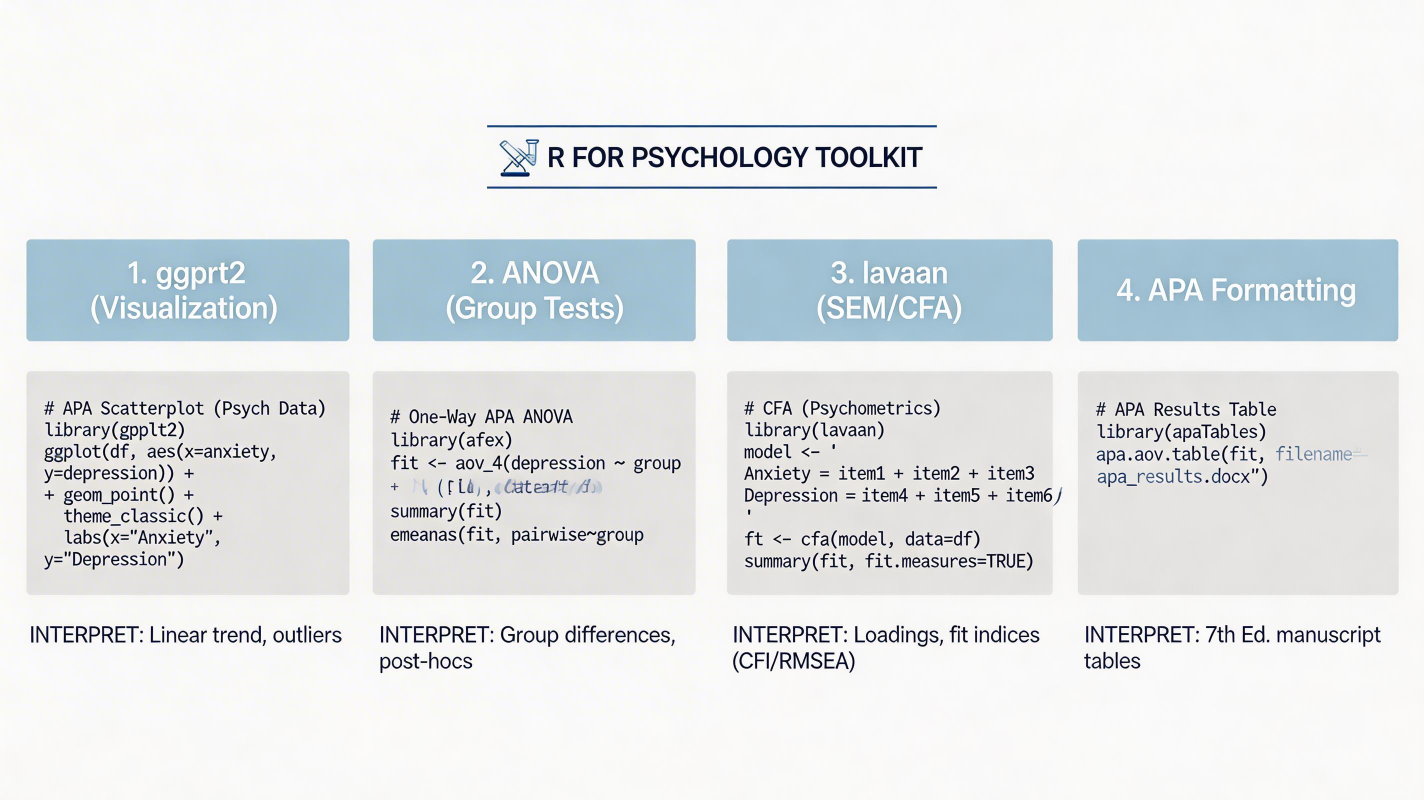 Copy-paste R code for every common psychology analysis — with interpretation prompts